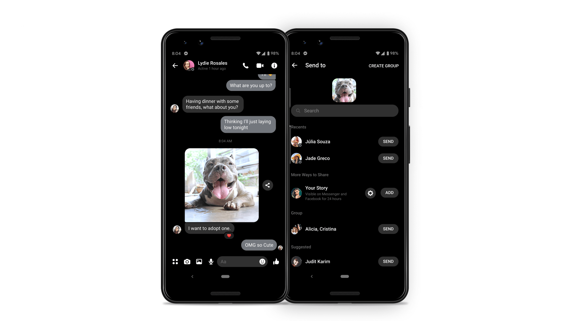 - Message forward: Pass along messages to your friends and family with this new feature! Long-pressing on a message will give you the option to forward. One you tap the ‘forward’ button, a share sheet will be displayed so you can share with one or many people or groups. You’ll also be able to create a new group before forwarding a message.